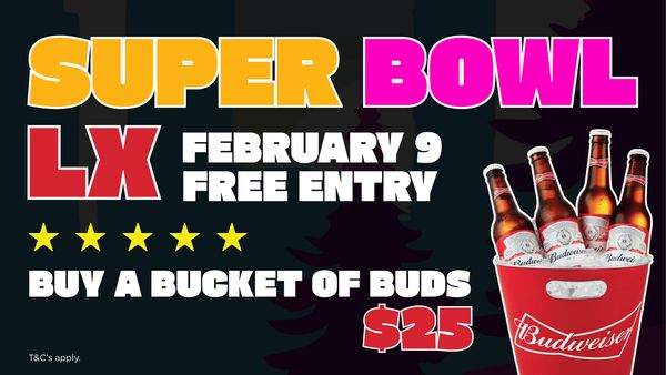 Enjoy a buzzing atmosphere plus $25 Budweiser buckets and a $20 pot and parma deal. The ultimate spot to catch the biggest game of the year.